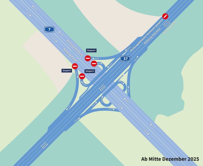 • Derzeit sind auch auf der A37 in Fahrtrichtung Celle die Ausfahrt auf die A7 in Richtung Hamburg sowie auf der A7 in Fahrtrichtung Kassel die Auffahrt auf die A37 nach Celle gesperrt. Diese Sperrungen werden bis voraussichtlich Mitte Dezember bestehen und anschließend aufgehoben. So lange ist auf der A37 in Fahrtrichtung Celle nur die Ausfahrt auf die A7 in Fahrtrichtung Kassel und die Auffahrt von der A7, Fahrtrichtung Hamburg, auf die A37 in Fahrtrichtung Celle möglich. Es gelten die gleichen Umleitungsstrecken über das Kreuz Hannover-Ost und die A2.