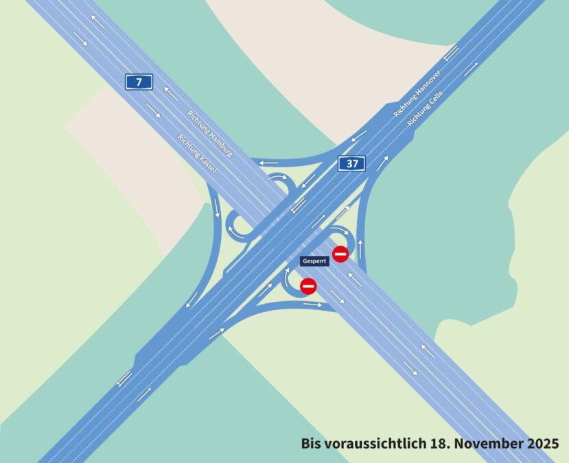 • Während der Bauzeit ist in Fahrtrichtung Hannover das Ausfahren von der A37 auf die A7 weder in Richtung Kassel noch in Richtung Hamburg möglich. Auch die Auffahrten von der A7 auf die A37 in Richtung Hannover sind aus beiden Fahrtrichtungen (Kassel/Hamburg) gesperrt. Verkehrsteilnehmende folgen für die Weiterfahrt jeweils den mit einem roten Punkt gekennzeichneten Umleitungen, die über das Autobahnkreuz Hannover-Ost und über die A2 führen.