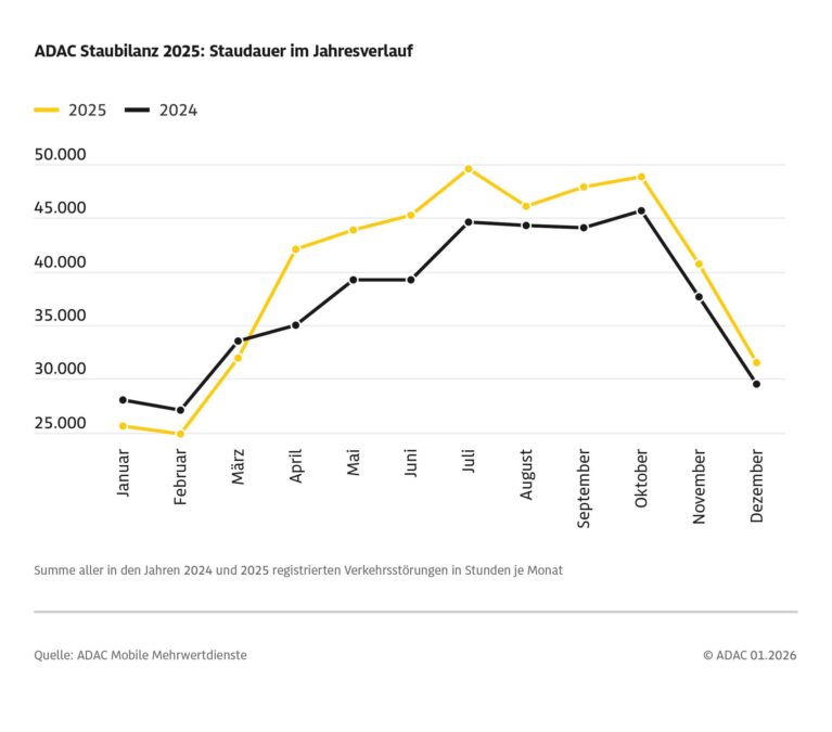 Nach Angaben des ADAC sank die Zahl der erfassten Staus 2025 auf rund 496.000, nachdem es im Jahr 2024 noch 516.000 waren. Dennoch nahm die Belastung für Verkehrsteilnehmer zu: Die Staustunden stiegen um rund sieben Prozent von 448.000 auf insgesamt 478.000 Stunden. Auch die Gesamtlänge der Staus erhöhte sich leicht und lag bei 866.000 Kilometern, nach 859.000 Kilometern im Vorjahr.