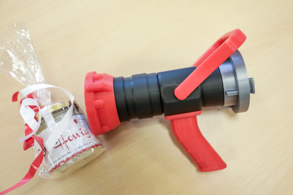 Zum Abschied bekam Jens Heindorf von Bürgermeister Mirko Heuer einen ungewöhnlichen Stifthalter: ein Hohlstrahlrohr, frisch aus dem 3D-Drucker.