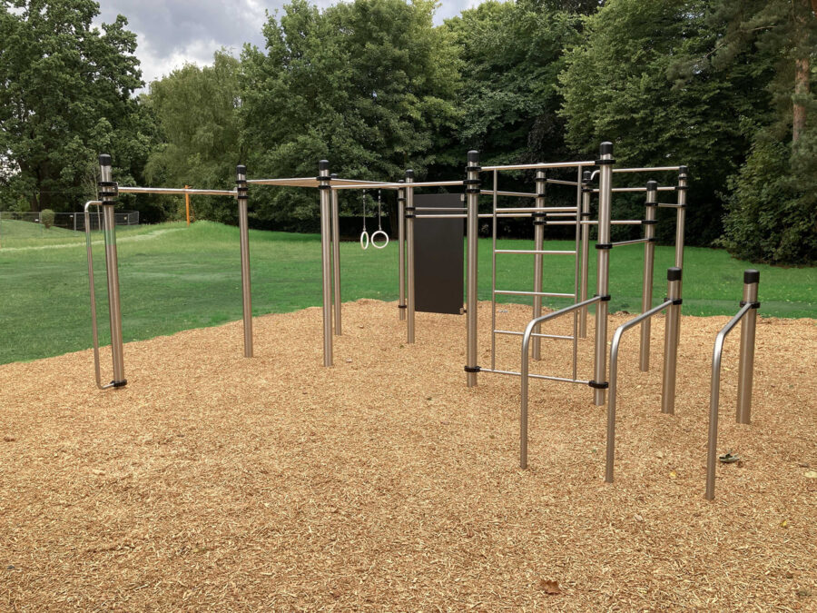 Ziel des Projekts ist es, ein attraktives und zugleich naturnahes Sportangebot zu schaffen, das sich harmonisch in die großzügige Grünfläche mit ihrem wertvollen Baumbestand einfügt. Die Anlage umfasst eine Vielzahl an Geräten für funktionelles Eigengewichtstraining, darunter Reckstangen und eine Hangelleiter in unterschiedlichen Höhen, eine Sprossenwand, verschiedene Barren sowie eine Schrägbank. Der Trainingsbereich wurde mit einem Fallschutz aus Holzhackschnitzeln ausgestattet, um maximale Sicherheit zu gewährleisten.