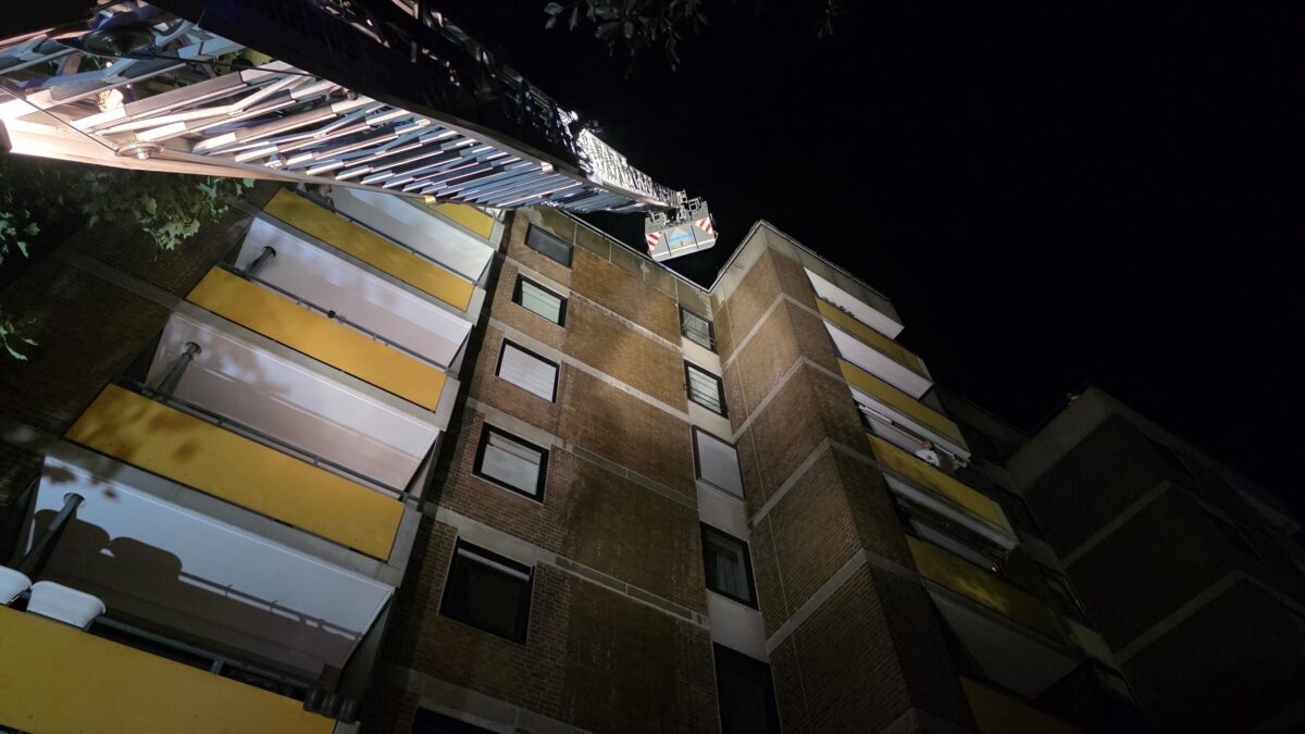 Vor Ort bestätigte sich die gemeldete Lage: Auf einer Dachterrasse im 8. Obergeschoss eines Mehrfamilienhauses brannte ein Blumenkübel. Art und Umfang des Brandes waren zunächst unklar. Da ein Zugang über die betroffene, unbewohnte Wohnung nicht möglich war, leitete die Feuerwehr die Brandbekämpfung zunächst über eine Drehleiter ein. Dabei kam ein Kleinlöschgerät zum Einsatz. Im weiteren Verlauf wurde ein C-Rohr über eine trockene Steigleitung zur Dachterrasse geführt, um die Brandbekämpfung effektiv fortzusetzen.