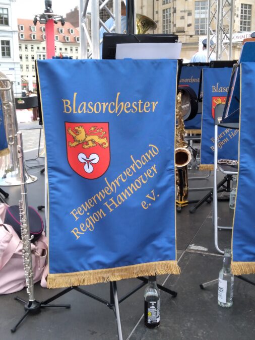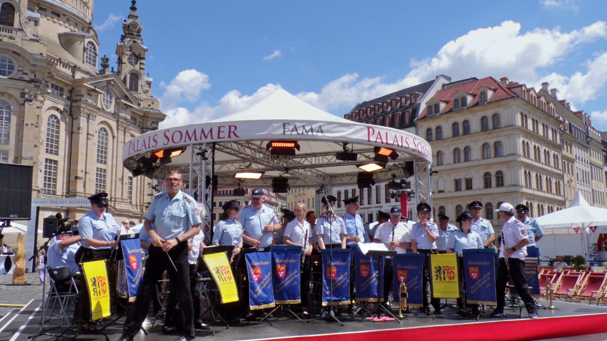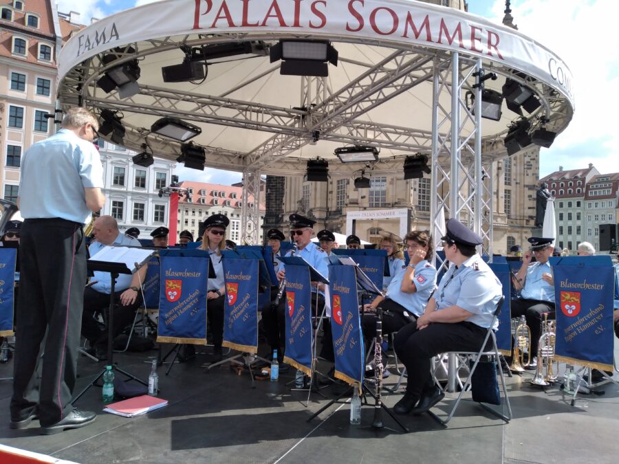 Dresden/Hannover (pm/redk). Das Blasorchester des Feuerwehrverbands Region Hannover e.V. hat am vergangenen Wochenende mit zwei Konzerten beim renommierten Kunst- und Kulturfestival „Palais Sommer“ in Dresden das Publikum begeistert. Bei strahlendem Sommerwetter spielten die Musikerinnen und Musiker auf dem Neumarkt vor der Frauenkirche vor zahlreichen Zuhörern ein abwechslungsreiches Programm quer durch verschiedene Musikstile – und ernteten begeisterten Applaus.