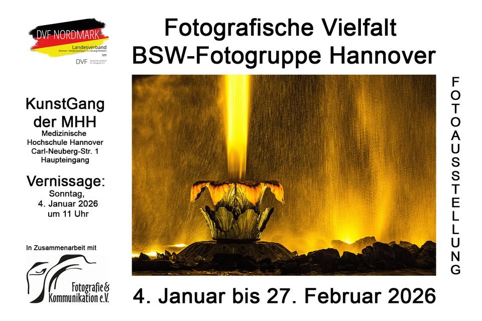 Hannover (pm/redk). Die BSW-Fotogruppe Hannover stellt ihre Fotoausstellung „Fotografische Vielfalt“ im KunstGang der Medizinischen Hochschule Hannover (MHH) aus. Die Ausstellung ist vom 4. Januar bis zum 27. Februar 2026 zu sehen. Organisiert wird sie in Zusammenarbeit mit dem Verein Fotografie & Kommunikation e.V., der seit Mai 2023 die Ausstellungen im KunstGang der MHH kuratiert.