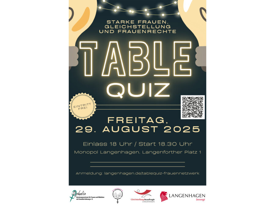 Langenhagen (pm/redk). Wissen trifft Engagement: Das Frauennetzwerk Langenhagen veranstaltet am Freitag, den 29. August 2025, ein großes Table Quiz im Monopol am Langenforther Platz 1. Die Besucherinnen und Besucher erwartet ein abwechslungsreicher Abend mit spannenden Quizrunden, der gleichzeitig auf gesellschaftlich wichtige Themen wie Gleichstellung, Frauenrechte und Empowerment aufmerksam macht. Einlass ist ab 18:00 Uhr, Beginn der Veranstaltung um 18:30 Uhr.
