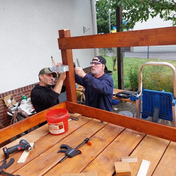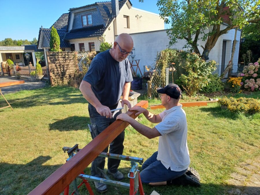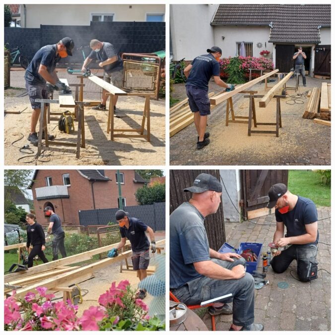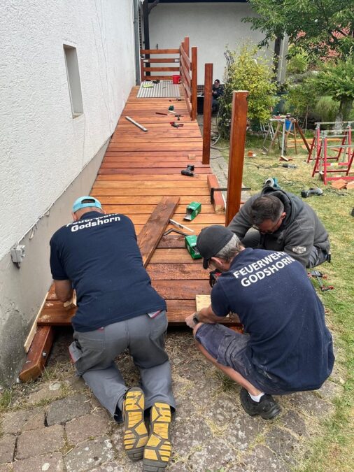 In Godshorn leben die Mitglieder den Leitspruch „Einer für alle, alle für einen“ nicht nur bei Einsätzen, sondern auch im privaten Alltag. Die Feuerwehr entschloss sich, eine barrierefreie Rampe zu bauen, die den Zugang von der Straße zum Haus erleichtert. Unter der Anleitung von Torsten O., „Projektleiter Rampe“, arbeiteten zahlreiche Kameradinnen und Kameraden eine Woche lang mit Holz, Pfosten, Bohlen, Geländern und Bodenblechen. Entstanden ist eine mehr als 10 Meter lange Abfahrt in den Garten, die die Mobilität der Familie nachhaltig verbessert.