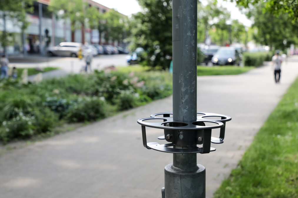 Die Ringe bestehen aus zwei Halbkreisen, die um Laternen oder Pfosten montiert sind. Die Befestigung an Mülleimern wurde bewusst vermieden, da deren Bauweise zu unterschiedlich ist. Stattdessen weisen zukünftig Aufkleber mit dem Logo des Jugendparlaments und einem erklärenden Hinweis auf die Nutzung hin.