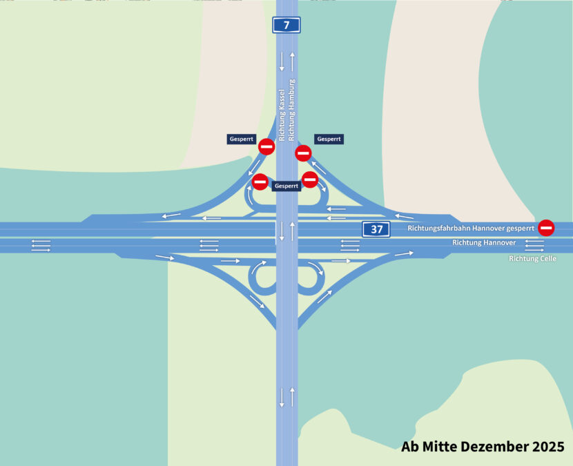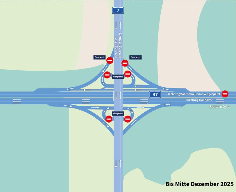Derzeit sind auch die Ausfahrt von der A37 in Fahrtrichtung Celle auf die A7 Richtung Hamburg sowie die Auffahrt von der A7 (aus Hamburg kommend) auf die A37 Richtung Celle gesperrt. Diese Sperrungen bleiben voraussichtlich bis Mitte Dezember bestehen. Bis dahin ist auf der A37 in Fahrtrichtung Celle nur die Ausfahrt auf die A7 Richtung Kassel und die Auffahrt von der A7 (Fahrtrichtung Hamburg) auf die A37 Richtung Celle möglich. Auch hier gelten die ausgeschilderten Umleitungen über das Kreuz Hannover-Ost und die A2.