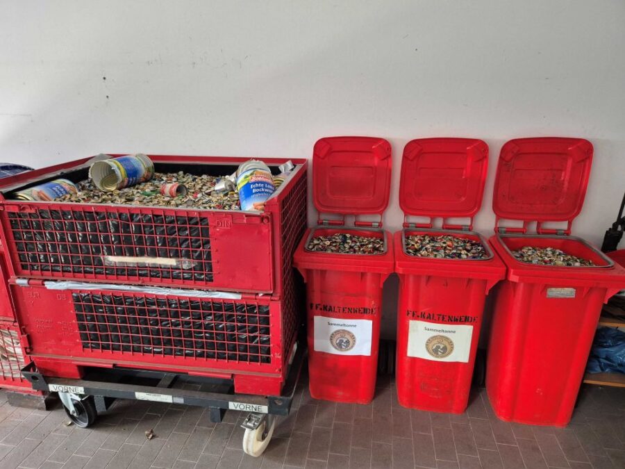 Die Resonanz auf die Sammelaktion wuchs schnell über Kaltenweide hinaus: Alle sechs Ortsfeuerwehren der Stadtfeuerwehr Langenhagen, zahlreiche Vereine sowie viele Bürgerinnen und Bürger beteiligen sich mittlerweile mit großen Kronkorkenspenden. Auch die Stadtverwaltung Langenhagen unterstützt die Aktion – federführend durch die Mitarbeitenden des Hauses der Jugend, die im Rathaus eine Sammelsäule aufgestellt haben. Dank zusätzlicher Werbung von Bürgermeister Mirko Heuer in den sozialen Medien konnte innerhalb von sechs Wochen eine komplette 120-Liter-Tonne mit Kronkorken gefüllt und an die Feuerwehr übergeben werden.