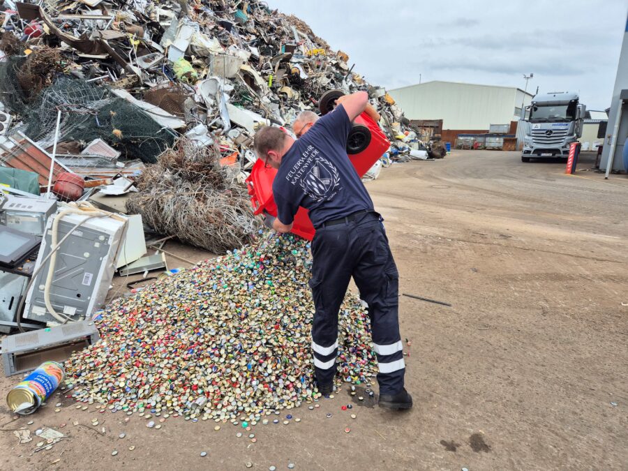 Seit Januar 2025 sammelten sich bereits drei volle Sammeltonnen sowie eine Euro-Gitterbox an. Da der Transport zu den Bundeswehrstandorten nicht mehr möglich war, wurde mit der Firma Otto Müller Recycling GmbH ein neuer Kooperationspartner gefunden. Am 10. September 2025 konnten die Kronkorken erstmals dort übergeben werden – mit beeindruckendem Ergebnis: Knapp eine halbe Tonne, exakt 430 Kilogramm, wurden vor Ort gewogen. Der Erlös daraus wird direkt an das Bundeswehr-Sozialwerk überwiesen, das damit die Ausbildung von Assistenz- und Therapiehunden für Soldaten mit Posttraumatischen Belastungsstörungen (PTBS) finanziert.