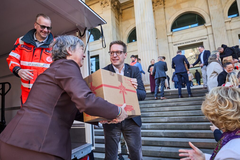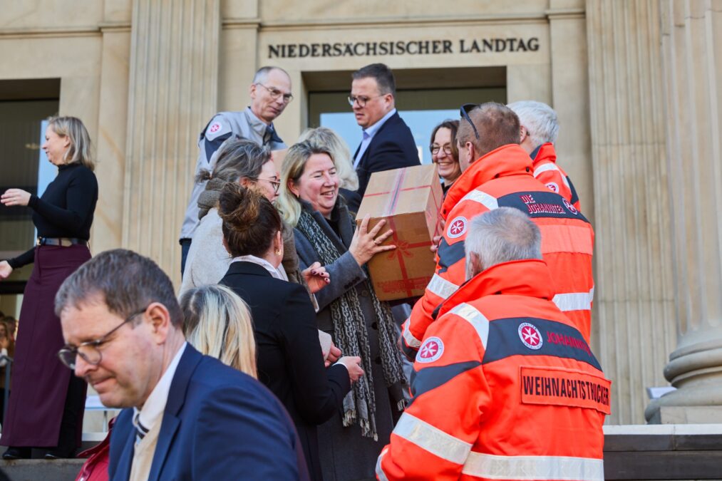 Der Niedersächsische Landtag hat sich auch in diesem Jahr am bundesweiten Spendenprojekt der Johanniter-Unfall-Hilfe e.V., dem Johanniter Weihnachtstrucker, beteiligt. Seit dem 17. November packten Mitarbeitende der Landtagsverwaltung und der Fraktionen sowie Abgeordnete des Landtages Weihnachtspäckchen, die zum Start des Dezember-Plenums an die Ehrenamtlichen des niedersächsischen Johanniter-Konvois übergeben wurden.
