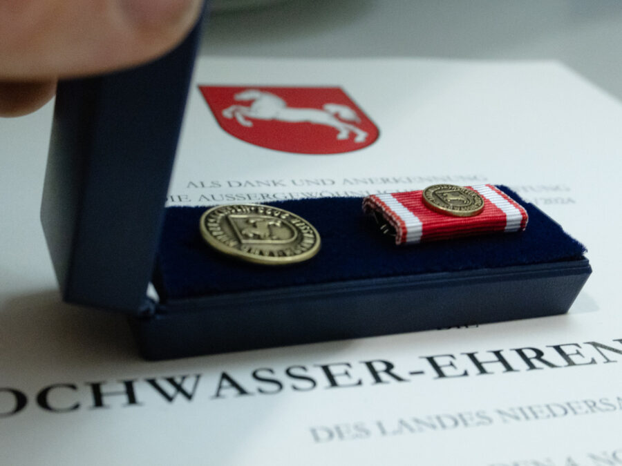 Darüber hinaus wurden allen Kameradinnen und Kameraden, die im Winter 2023/2024 an den Einsatzstellen oder im Hintergrund während des Hochwassers im Einsatz waren, die Hochwasser-Ehrennadel verliehen.