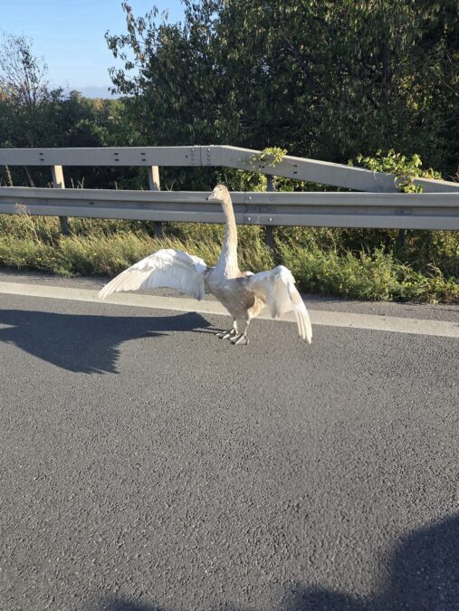 Vor Ort stellte sich heraus, dass es sich nicht um eine Gans, sondern um einen noch flugunfähigen Jungschwan handelte. Das aufgeregte und teilweise aggressive Tier versuchte mehrfach, auf die Autobahn zu laufen – eine Gefahr sowohl für sich selbst als auch für den Verkehr.