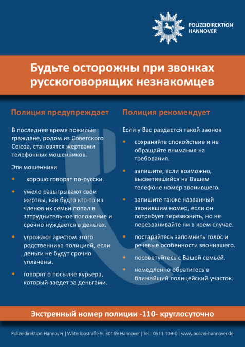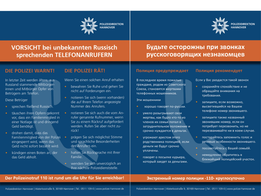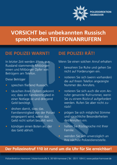 Polizei warnt vor neuer Betrugsmasche bei sogenannten Schockanrufen - gezielt russischsprachige Senioren betroffen. - Quelle: Polizeidirektion hannover