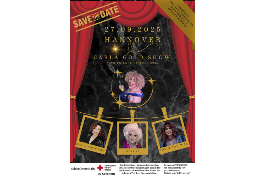 Langenhagen/Godshorn (pm/redk). Der DRK Ortsverein Godshorn lädt am Samstag, den 27. September 2025, zu einer besonderen Benefizveranstaltung ein: Zum ersten Mal präsentieren Carla Gold, Eve Champainge, Mary Kö und Dolly van Dyk gemeinsam eine mitreißende Travestieshow – mit viel Charme, Livegesang und einem starken sozialen Anliegen.