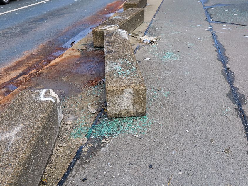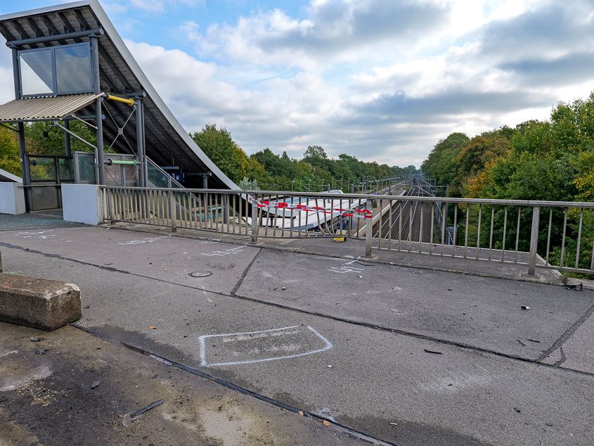 Der Unfall ereignete sich auf einer Brücke über die Gleisanlagen der Deutschen Bahn. Dabei kollidierte das Fahrzeug mit einem Betonpoller, der durch die Wucht des Aufpralls auf die Bahnanlagen geschleudert wurde. In der Folge wurde eine Oberleitung beschädigt. Ein durchfahrender, vollbesetzter Zug wurde in Mitleidenschaft gezogen und musste stoppen. Ein weiterer Zug kam ebenfalls zum Stehen. Die Fahrgäste verblieben zunächst in den Zügen.