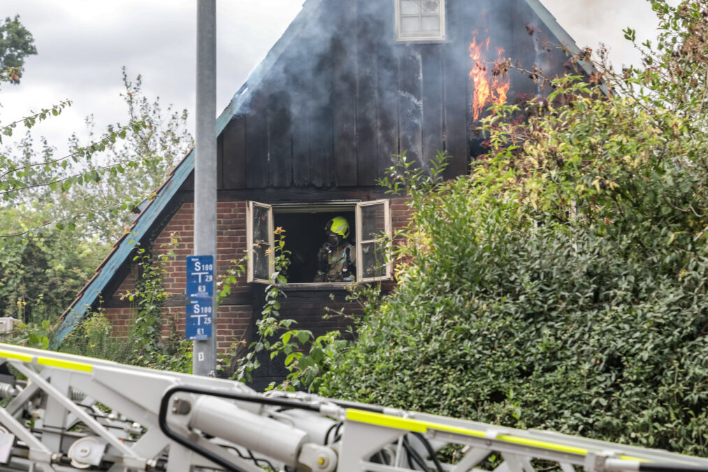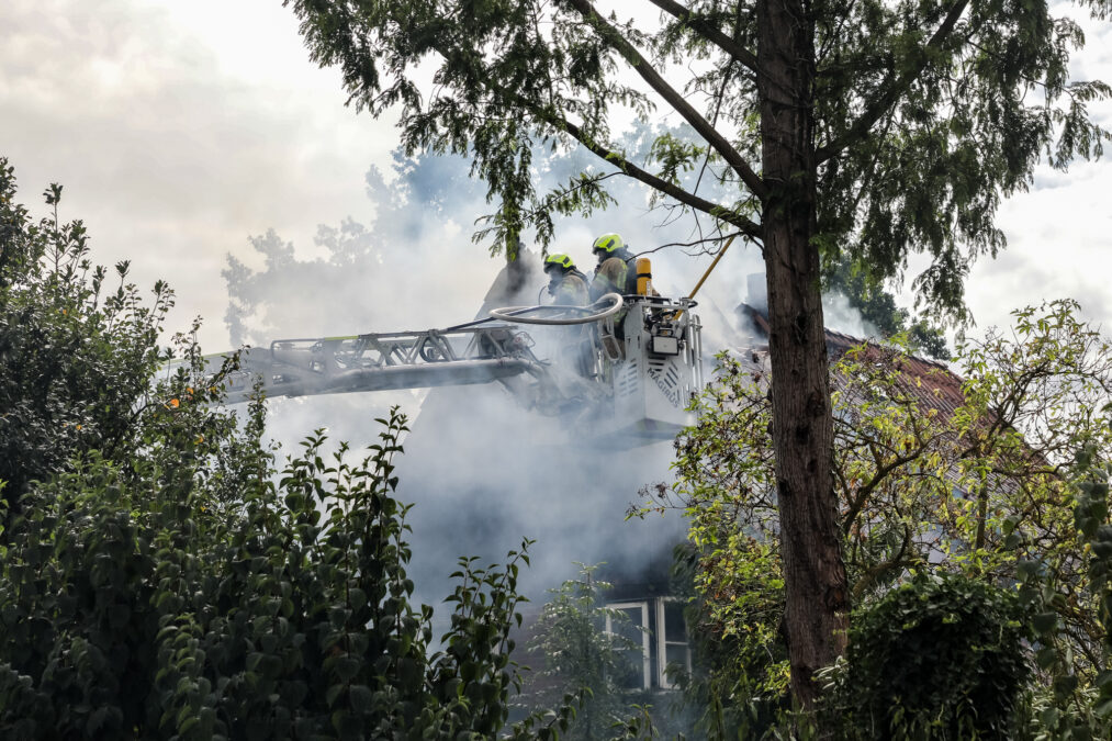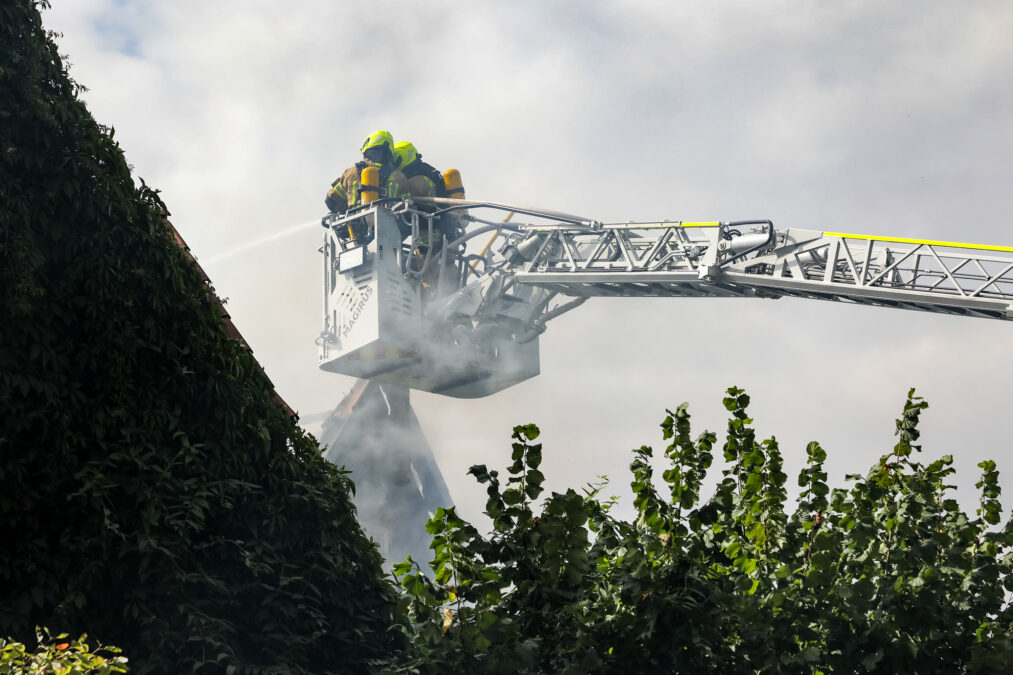 Atemschutzgeräteträger drangen in das Gebäude ein und leiteten sofort Löschmaßnahmen ein. Im weiteren Verlauf wurde mit Unterstützung der Drehleiter ein Teil der Dachhaut geöffnet, um Brandnester aufzuspüren und gezielt abzulöschen.