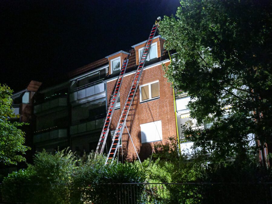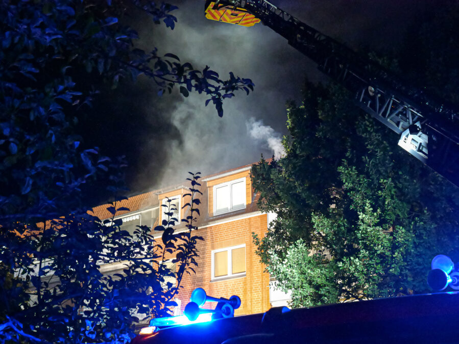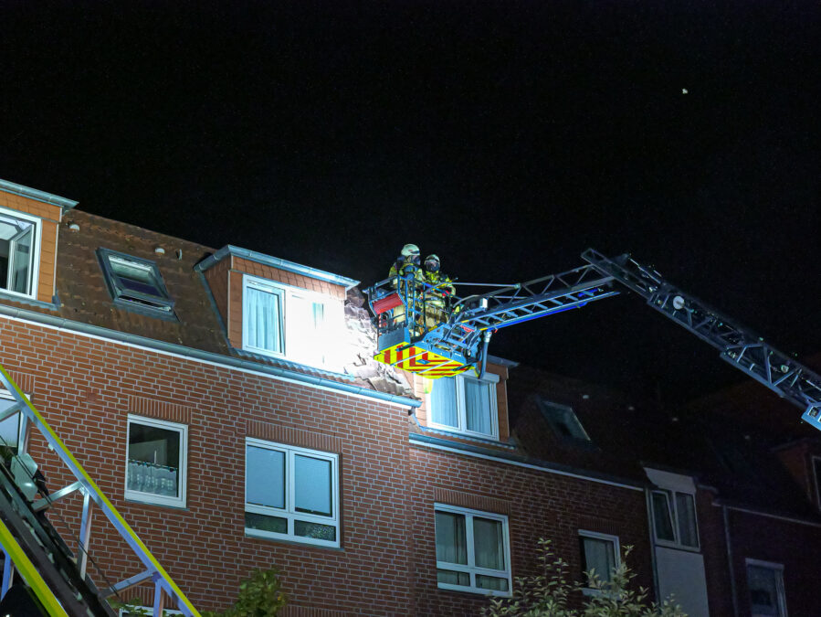 Trotz des zügigen Löschangriffs griffen die Flammen auf den Dachstuhl über. Um Glutnester im Dachbereich zu bekämpfen, setzte die Feuerwehr neben zwei Schiebleitern auch spezielle Löschlanzen („Fog Nails“) ein.