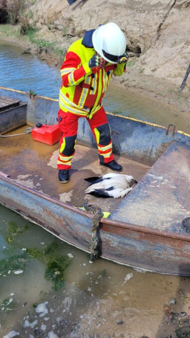 Am heutigen Montag um 11:40 Uhr wurden die Einsatzkräfte zur Ramhorster Straße nahe Steinwedel gerufen. Dort hatte ein Mitarbeiter eines ortsansässigen Kieswerks einen geschwächten Jungstorch entdeckt. Das Tier war völlig erschöpft, nass und zeigte keine Anzeichen von Fluchtverhalten. Der aufmerksame Mitarbeiter setzte den Storch vorsichtig in ein Boot und alarmierte die Feuerwehr.